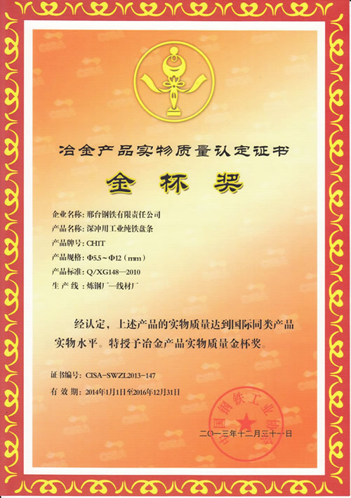 深沖用工業(yè)純鐵盤條CH1Tφ5.5~12mm獲冶金產(chǎn)品實(shí)物質(zhì)量金杯獎(jiǎng)