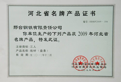 三人牌盤條被評為2009年河北省名牌產品