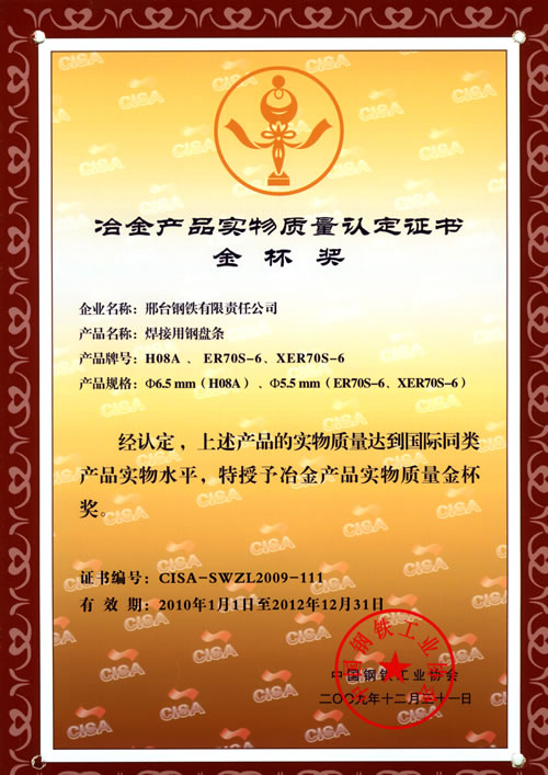 焊接用鋼盤條H08A、ER70S-6、XER40S-6獲冶金產品實物質量金杯獎