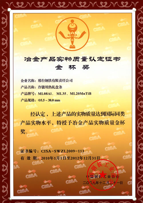 冷鐓用熱軋盤條ML08AL、ML35、ML20MnTiB獲冶金產品實物質量金杯獎