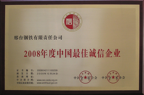 - 邢鋼榮獲2008年度“中國(guó)最佳誠(chéng)信企業(yè)”榮譽(yù)稱(chēng)號(hào)