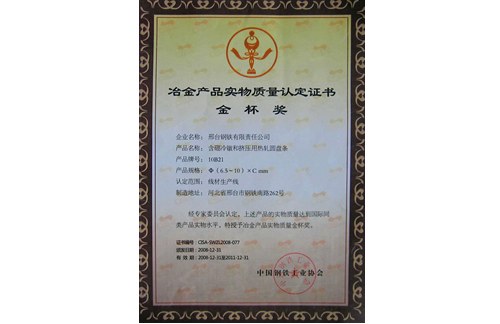 2008年12月31日,邢鋼含硼冷鐓和冷擠壓用鋼盤(pán)條10B21獲冶金產(chǎn)品實(shí)物質(zhì)量金杯獎(jiǎng)。