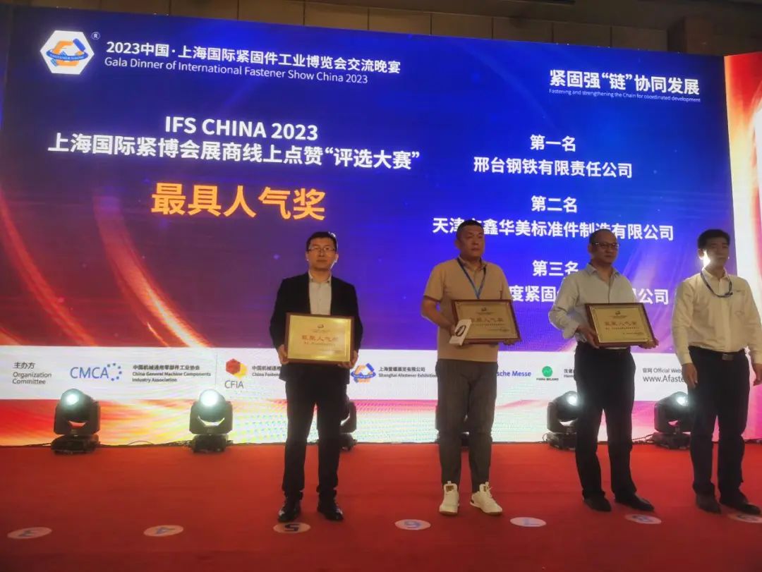 5月22日獲悉,在2023中國上海國際緊固件工業(yè)博覽會上,邢臺鋼鐵有限責任公司榮獲IFS CHINA 2023 上海國際緊博會展商線上點贊“評選大賽”第一名,獲得“最具人氣獎”獎項,并被授予獎杯及證書。