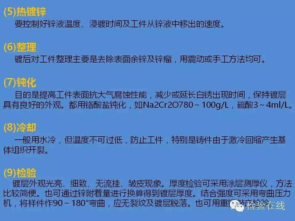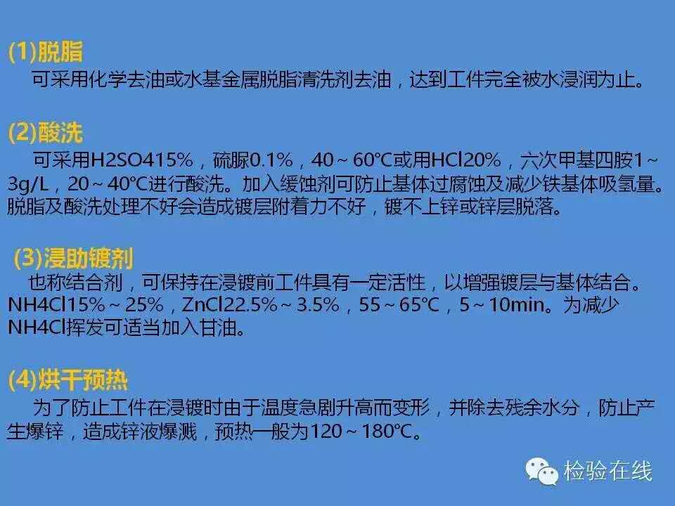 工件→脫脂→水洗→酸洗→水洗→浸助鍍?nèi)軇?rarr;烘干預熱→熱鍍鋅→整理→冷卻→鈍化→漂洗→干燥→檢驗