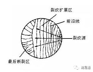疲勞斷裂經(jīng)歷了裂紋萌生和擴展過程。由于應(yīng)力水平較低,因此具有較明顯的裂紋萌生和穩(wěn)態(tài)擴展階段,疲勞斷裂的宏觀斷口一般由三個區(qū)域組成,即疲勞裂紋產(chǎn)生區(qū)(裂紋源)、裂紋擴展區(qū)和最后斷裂區(qū)。