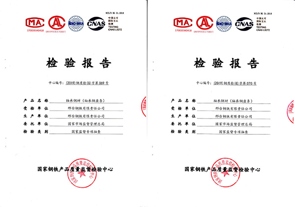 受國家市場監(jiān)督管理總局委托,2019年11月國家鋼鐵產品質量監(jiān)督檢驗中心對邢鋼高碳鉻軸承鋼進行了監(jiān)督抽查,判定依據為《2019年軸承鋼材產品質量國家監(jiān)督專項抽查方案》,現場抽取了2個批次盤條,近日公司收到檢測報告2個,結論為:所檢項目符合GB/T18254-2016《高碳鉻軸承鋼》標準及抽樣方案,判定合格,報告中顯示,7大項29個項目結果全部高于該產品標準,達到了高級優(yōu)質鋼級別水平。