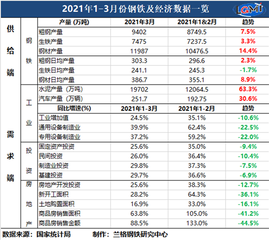 蘭格追蹤:2021年1-3月鋼鐵及經(jīng)濟數(shù)據(jù)一覽