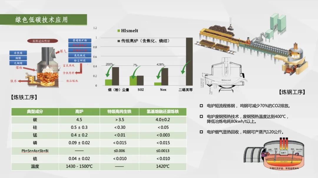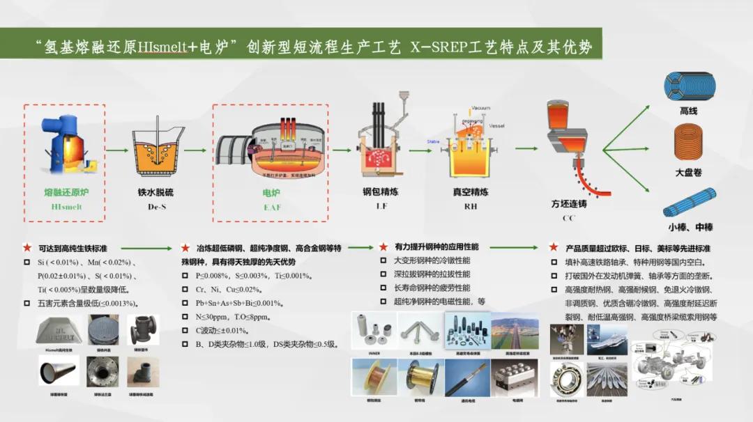 一是布局“碳達峰、碳中和”,實現(xiàn)綠色化,引領品牌可持續(xù)發(fā)展。采用的“熔融還原+電爐煉鋼”短流程工藝,取消了燒結(jié)、球團、焦化、預還原等工藝環(huán)節(jié),為世界首創(chuàng);和長流程工藝相比,預計可減少二氧化硫、氮氧化物排放38%,減少顆粒物排放89%,建廠即達到A級企業(yè)標準,實現(xiàn)綠色冶金,對我國乃至世界鋼鐵行業(yè)發(fā)展具有創(chuàng)新性和引領示范的意義,是鋼鐵行業(yè)綠色轉(zhuǎn)型的典范。