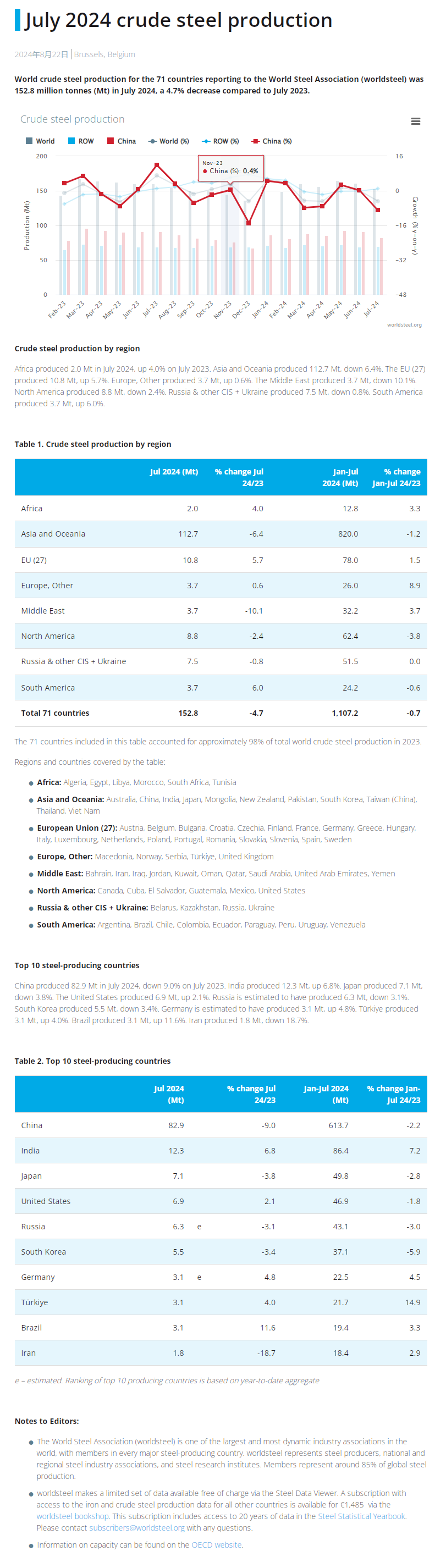 來源:世界鋼鐵協(xié)會 發(fā)布時間:2024年08月27日 點擊數(shù):