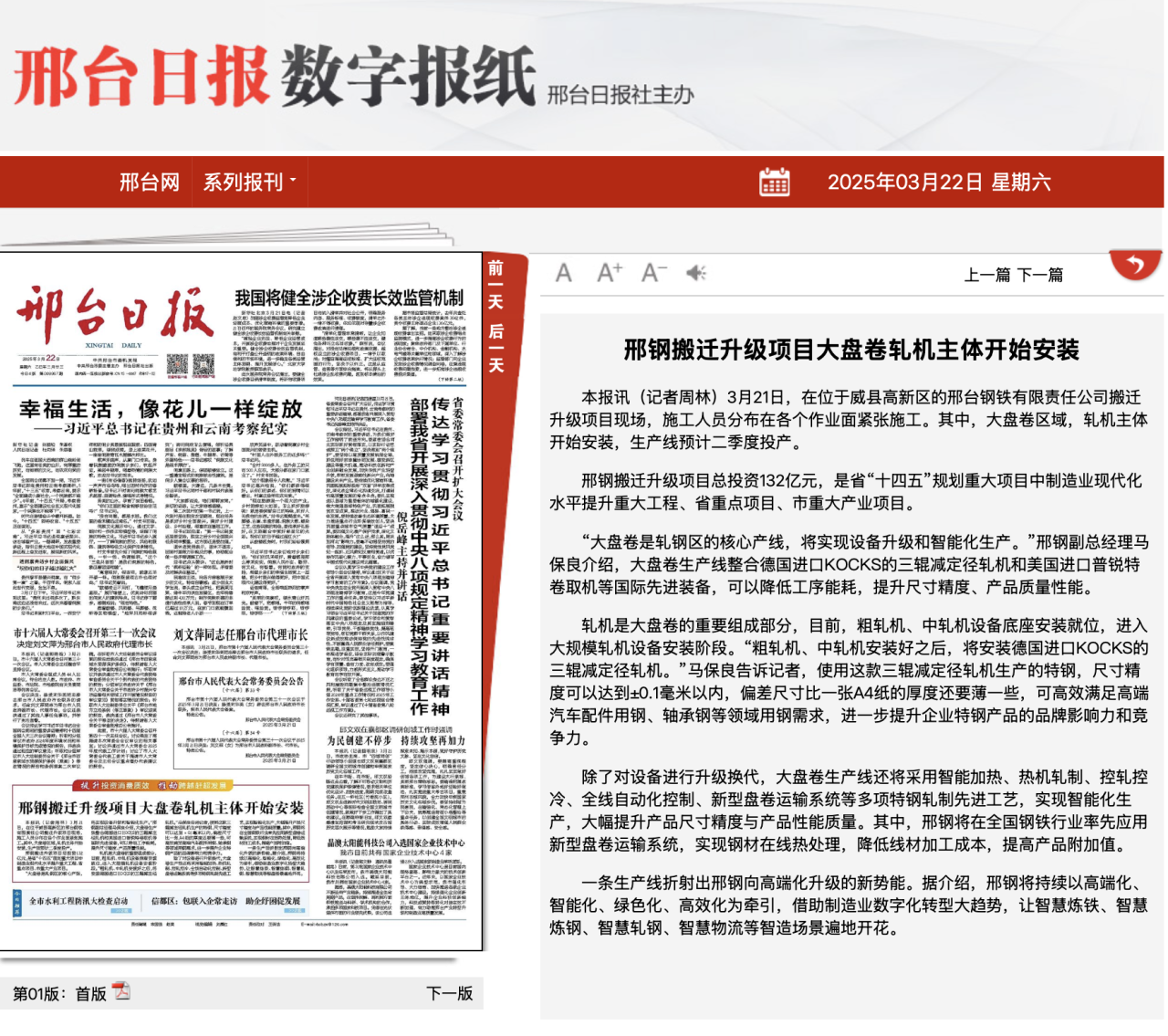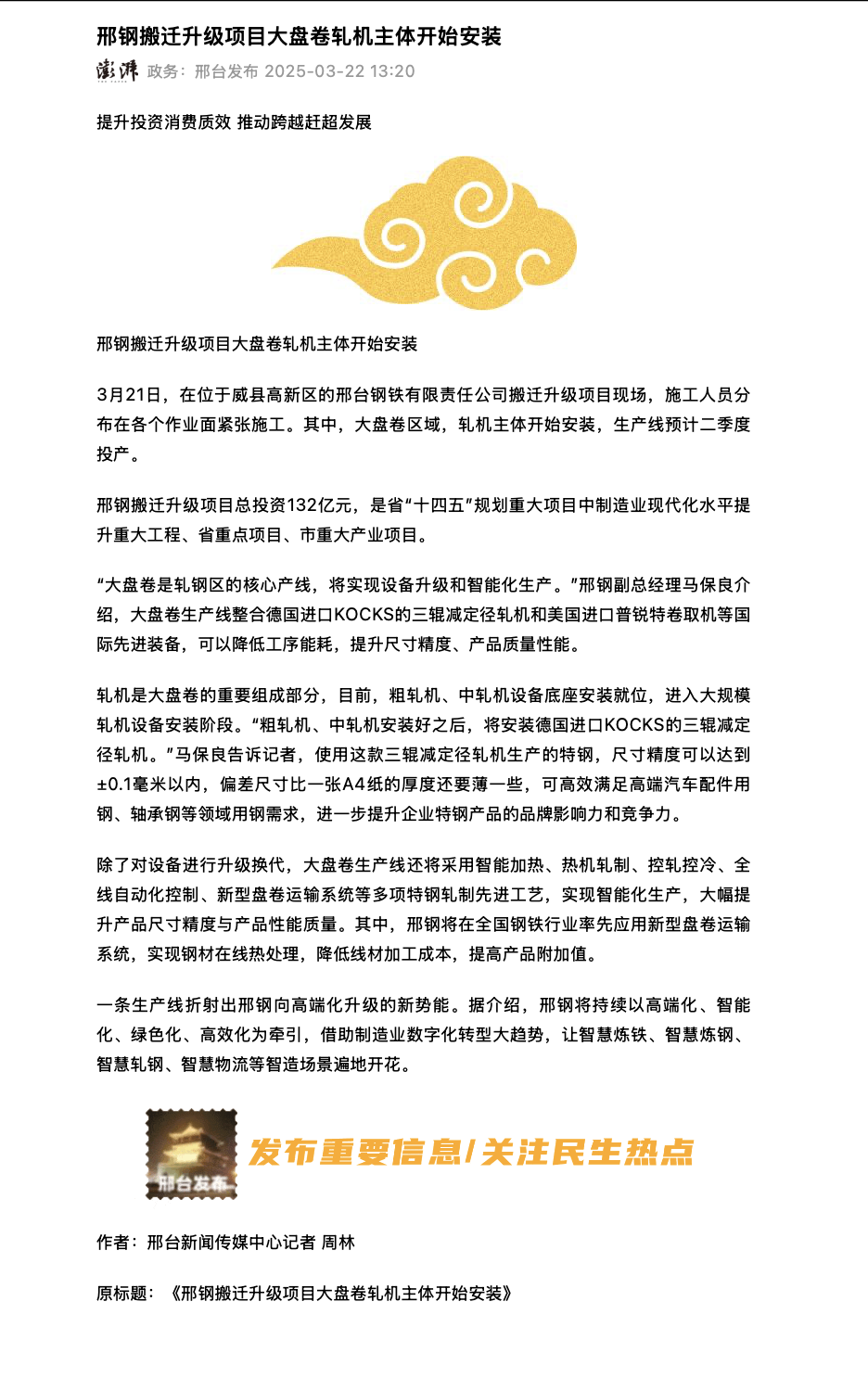 邢鋼搬遷升級(jí)項(xiàng)目總投資132億元,是省“十四五”規(guī)劃重大項(xiàng)目中制造業(yè)現(xiàn)代化水平提升重大工程、省重點(diǎn)項(xiàng)目、市重大產(chǎn)業(yè)項(xiàng)目。     “大盤卷是軋鋼區(qū)的核心產(chǎn)線,將實(shí)現(xiàn)設(shè)備升級(jí)和智能化生產(chǎn)。”邢鋼副總經(jīng)理馬保良介紹,大盤卷生產(chǎn)線整合德國(guó)進(jìn)口KOCKS的三輥減定徑軋機(jī)和美國(guó)進(jìn)口普銳特卷取機(jī)等國(guó)際先進(jìn)裝備,可以降低工序能耗,提升尺寸精度、產(chǎn)品質(zhì)量性能。