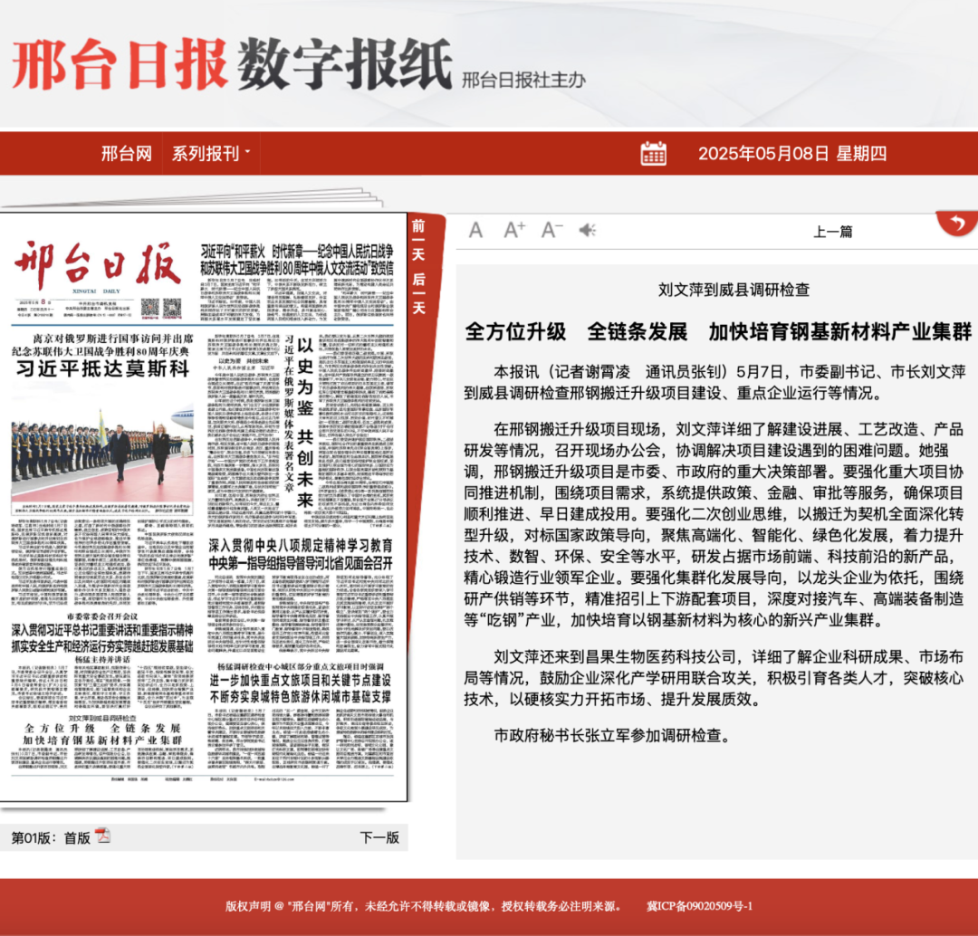 本報訊(記者謝霄凌 通訊員張釗)5月7日,市委副書記、市長劉文萍到威縣調(diào)研檢查邢鋼搬遷升級項目建設(shè)、重點企業(yè)運行等情況。